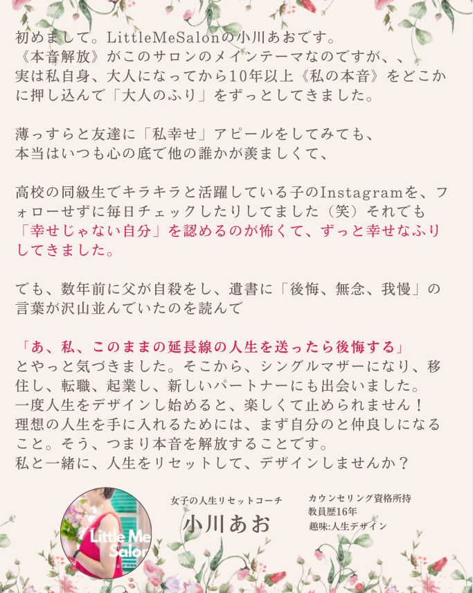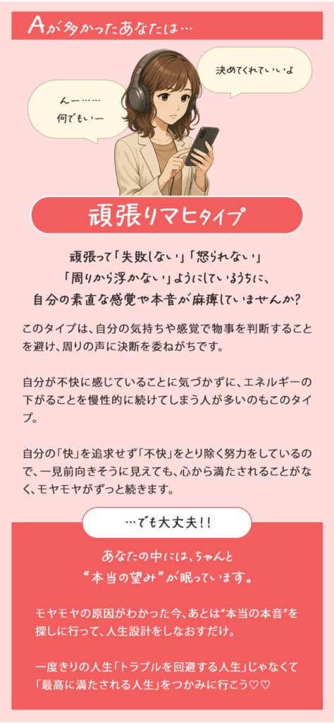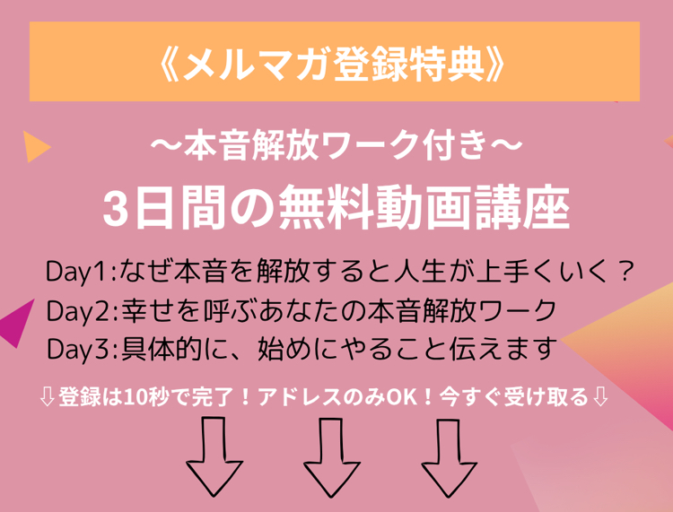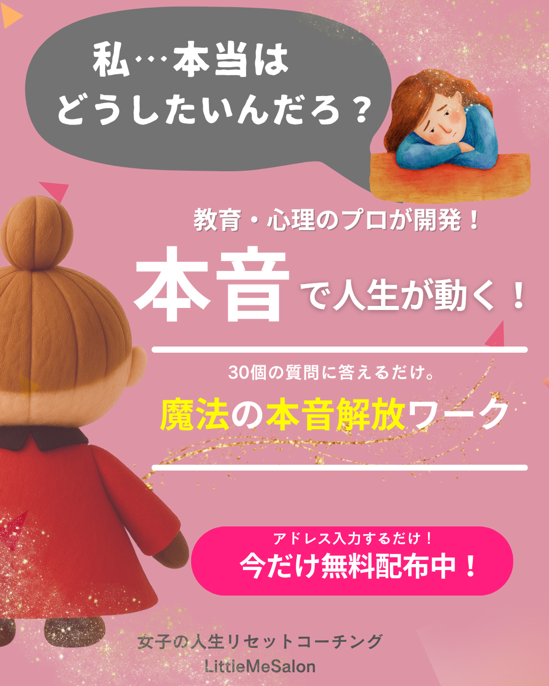 サンプル動画の続きが見れる! < 3日間無料動画講座を受け取る メールアドレス こんなお悩みありませんか? 決断を委ねられるが苦手 いつも無難な服ばかり着ている 休日になにもせずに終わることが多い 食べたいものがよく分からない 気楽に楽しめる娯楽が好きだ 会うと疲れるけど仲良くしてる人がいる つい相手に意見を合わせてしまう 評価されたくて頑張ってしまう 家事や育児などちゃんとやってる方だ 「すみません」が口癖だ お菓子やお土産をよく配る 上手にサボっている人はずるいと思う 心を整える本をよく読む 自分の力を出し切れていない気がする 今の自分にどこか満足できていない 「時間さえあれば、、」とよく思う やりたいことはあるのに動けない このまま終わりたくないと思う時がある 親の期待に答えようとしてきた 人にどう見られるかを気になる みんなと同じ方が安心する 気づくと誰かと自分を比べてしまう 普通の幸せから外れたくないと思う 自分を責めてしまう時がある A:0 個 B:0 個 C:0 個 D:0 個 合計:0 個 あなたは… まだ判定されていません ⚠️ チェックが10個以上あった人…思ってる以上に重症です…。 サンプル動画の続きが見れる! 3日間無料動画講座を受け取る メールアドレス サンプル動画の続きが見れる! 3日間無料動画講座を受け取る メールアドレス サンプル動画の続きが見れる! 3日間無料動画講座を受け取る メールアドレス サンプル動画の続きが見れる! 3日間無料動画講座を受け取る メールアドレス 3日間無料動画講座を受け取る メールアドレス